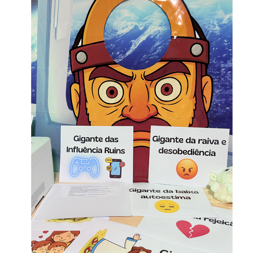 Esse material incrível foi desenvolvido para auxiliar você titia para esclarecer as crianças que nos estamos em constantes batalhas e mas podemos vencer em Cristo Jesus. Cada criança irá conhecer os “gigantes” que se levantam contra a infância : medo, rejeição, raiva, dor escondida (@buso) e o vício em telas, elas estarão prontas para romper e vencer!